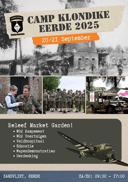 Camp Klondike is geopend op zaterdag 20 en zondag 21 september 2025 van 09:30 tot 17:00 uur en vindt plaats aan de Zandvliet in Eerde. Ook wordt er op 17 september al stilgestaan bij de offers die tijdens Operation Market Garden zijn gebracht. Hiervoor organiseert Airborne Comité Eerde een herdenking bij het 501 monument vanaf 19:00 uur.