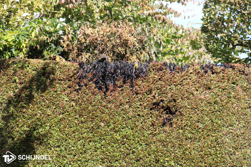 Aan de buitenkant was slechts een zwarte plek bovenin de haag te zien, in de tuin was de schade groter. De brandweermannen hebben nog wel een controle gedaan maar het vuur was al uit. De eigenaar heeft veel geluk gehad door zijn eigen snelle ingrijpen. Hoe de brand kon ontstaan is onbekend.