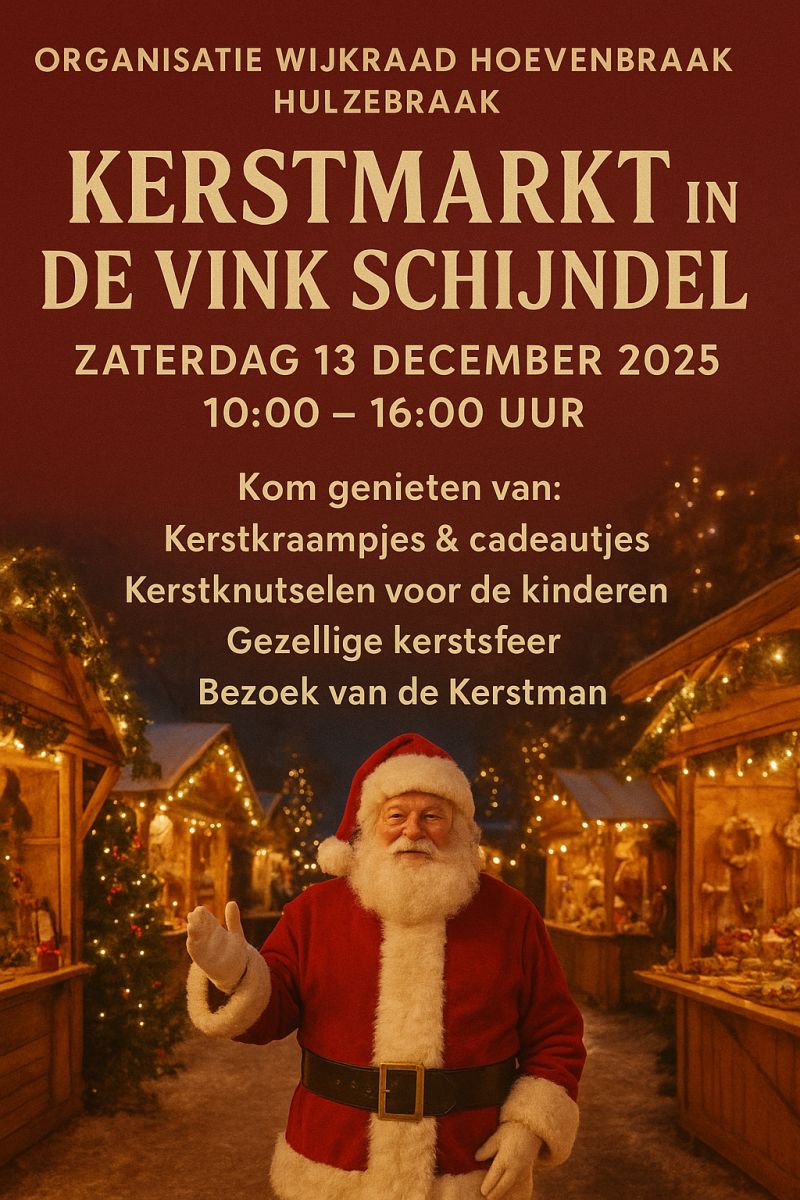 gebouw vink2025Schijndel - Op zaterdag 13 december tussen 10 en 16 uur organiseert Wijkraad Hoevenbraak Hulzebraak weer een kerstmarkt. De entree is gratis. Cultureel Centrum De Vink zal worden omgetoverd naar een gezellige in kerstsferen gehulde zaal, met diverse kramen waar geshopt kan worden. Ook is de enige echte Kerstman aanwezig en kun je met hem op de foto. Uiteraard is er een knutseltafel voor de kinderen en kunnen zij zich laten schminken. Kinderpopkoor No Kidding komt optreden en we verwachten tevens de Swingende Zingende Kerstman.