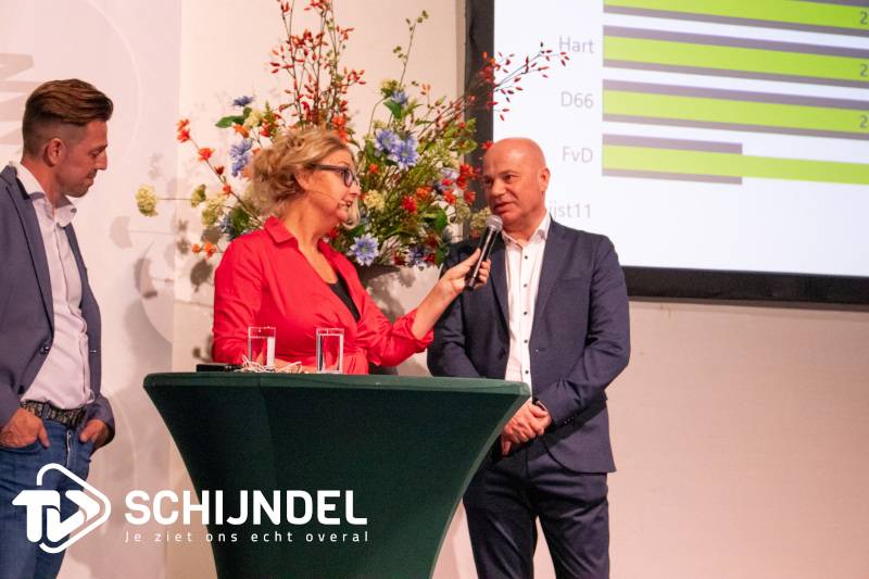Hella van der Wijst en burgemeester Van Rooij sloten de avond af en spraken een woord van grote dank uit aan alle technici en specialisten die in het zenuwcentrum achter de schermen in allerijl de stemmen verwerkten en zorgden voor een prachtige, duidelijke, overzichtelijke presentatie op de schermen in de theaterzaal.