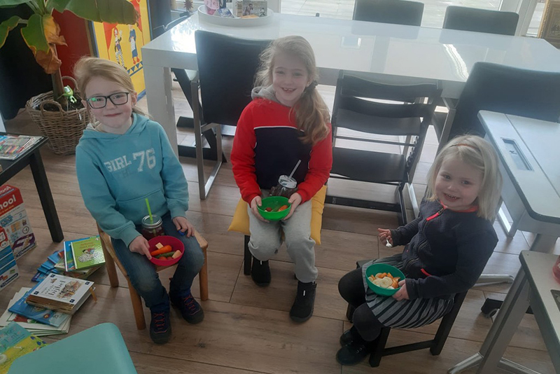 Gisteren kregen de ouders een brief van Skopos waarin afspraken met betrekking tot de opvang werden gemaakt. “Wij hebben van school nog niets gehad aan lesmateriaal of tips, maar wij hebben thuis zelf veel materialen zoals Squla spelling spel, Rompompom (kleuterschoolmethode), Aviboekjes, (mini)loco voor alle leeftijden (voor Isabelle begrijpend lezen en Engels), Clementoni spellen en knutsel spullen. Van Heesch plukt ook de vruchten van haar baan als kindercoach: “Ik heb natuurlijk veel materialen in mijn praktijk, dus dat is ook voor de kinderen fijn.” De dagindeling voor vandaag lijkt zoveel mogelijk op wat de kinderen ook op school gewend zijn. “De kinderen lezen ieder op hun eigen niveau. Julie gaat lekker plaatjes kijken, en daarna doet eenieder een werkje op ieder niveau.” Natuurlijk is er ook ruimte voor ontspanning. Van Heesch: “Lekker fruit eten en buiten spelen hoort ook bij een schooldag! Na het buiten spelen gaan we nog even rekenen en daarna knutselen tot aan de boterham en dan is het afgelopen en zijn ze lekker vrij.” En wat de kinderen ervan vinden? Van Heesch: “De kinderen geven zelf aan hoe het normaal op school gaat, dus dat is wel erg leuk. Ze zijn mega enthousiast, maar missen hun vriendjes en vriendinnetjes wel.”