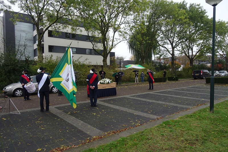 In het crematorium begeleidden de gilde-leden Wim naar binnen met het slaan van de dodenmars. De vaandrig bleef met het hoofdvaandel aan het hoofdeinde van Wim staan i.v.m. de erewacht. Aan het einde van de dienst bracht de vaandrig een ere-groet waarna het 6e couplet van het Wilhelmus werd gezongen. Nadat de genodigden afscheid hadden genomen, werd de sjerp en hoed van Wim van de kist gehaald. Het was een waardig afscheid, die door de gilde-leden werd afgesloten met een diepe buiging.