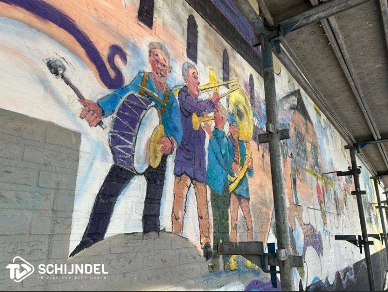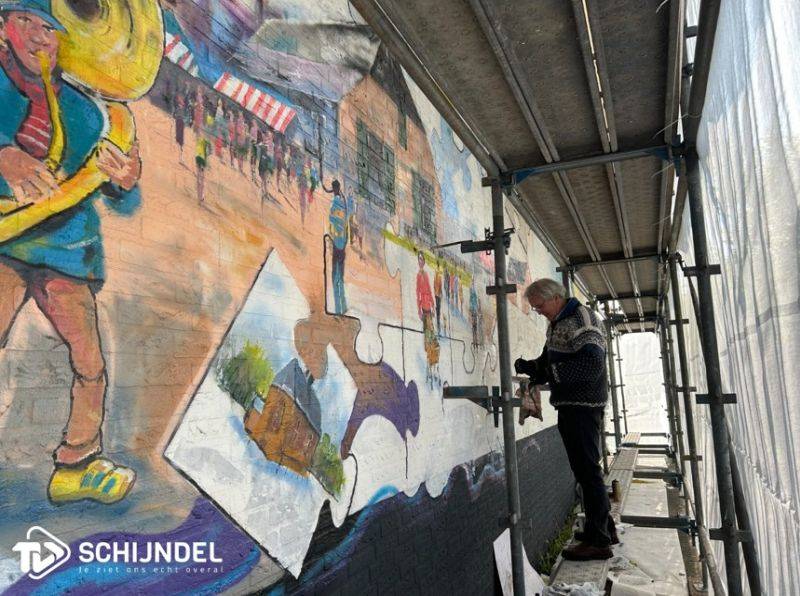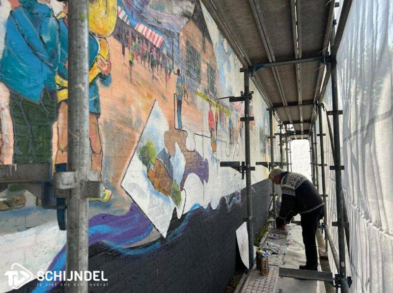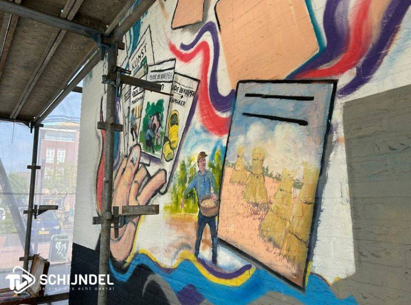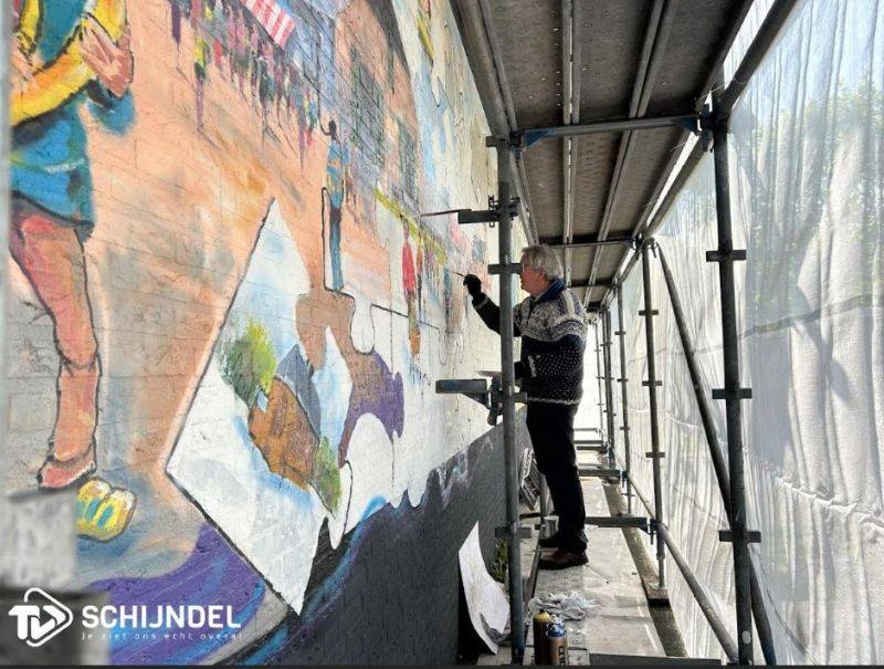 Rein is dit kunstwerk aan het schilderen op een muur van 19 m breed en 6 m hoog. Wethouder Johan van Gerwen zal het kunstwerk onthullen op zaterdag 9 mei om 14.00 uur.