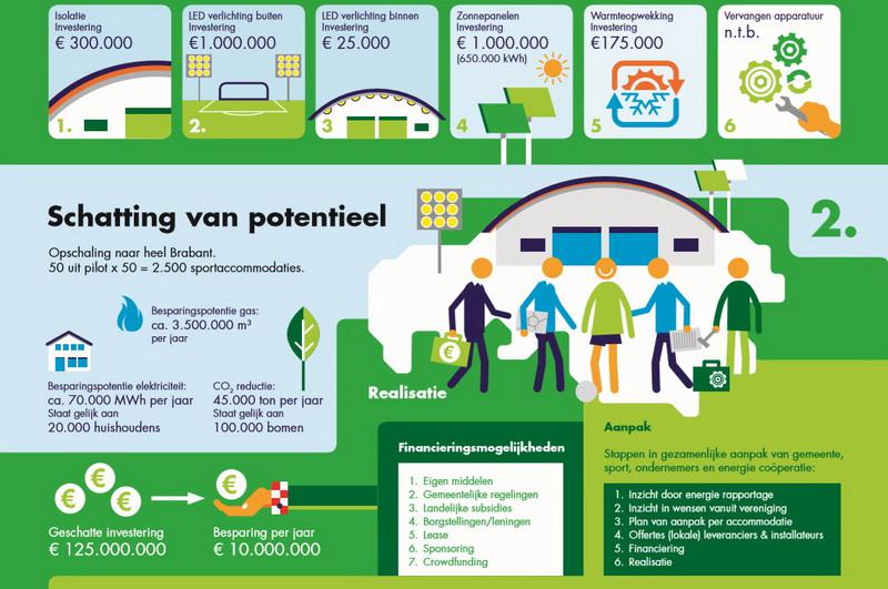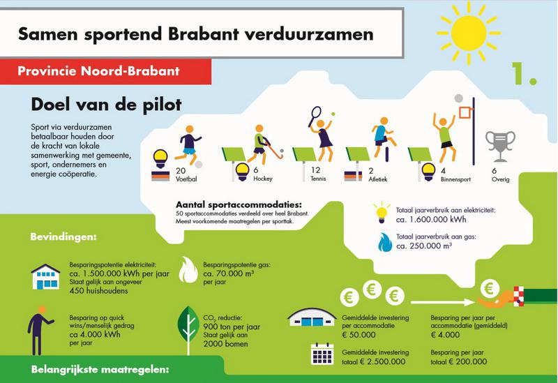 Sportaccommodaties maken een belangrijk onderdeel uit van de doelstelling om de gebouwde omgeving van Brabant te verduurzamen. Er zijn ongeveer 2000 sportaccommodaties in Brabant die de komende tijd een duurzaamheidsslag kunnen maken. Bijkomend effect van het verduurzamen van sportaccommodaties is dat leden van clubs waar maatregelen worden genomen, ook eerder thuis hiermee aan de gang gaan.