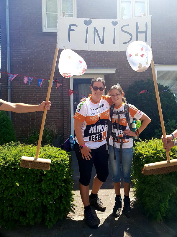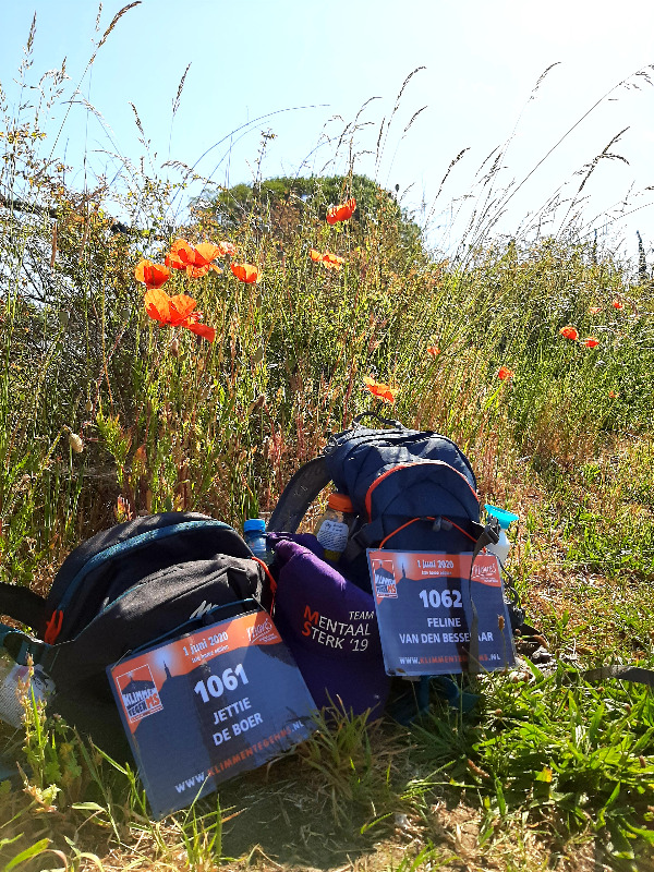"We zijn dus tweede pinksterdag om kwart over zeven vertrokken vanuit thuis. En zo vanuit Schijndel naar Sint Michielsgestel gelopen. Daar bij de supermarkt even wat drinken (anders dan water) gekocht. Vervolgens naar Vught, waar mijn broer en ons nichtje ons kwam aanmoedigen met een mooi spandoek. In het park een pastasalade gegeten. Toen begon het wel heet worden en terwijl iedereen het terras op ging (die onderweg allemaal klaargezet werden) mochten wij dwars door de Moerputten over de brug. En over een snikheet zandpad. Maar uiteindelijk konden we door Vlijmen naar Nieuwkuijk waar we door vrienden zijn verwelkomd met een mooie finish na 24 km. wandelen. Daar is Feline lekker de jacuzzi ingegaan met haar vriendin met een feestelijk drankje. En kon ik eindelijk met onze vrienden bijkletsen. Want die had ik door de corona ook niet meer gezien. Ties (papa) en Pleun (zusje) hebben ons opgehaald met een bos bloemen voor mij en Celebrations chocolade voor Feline. Heel anders dan de 'echte' Mont Ventoux, maar 's ochtends was ze net zo zenuwachtig als dat ze op de echte berg had gestaan. En nu gaan we volgend jaar. Feline heeft op deze dag ook bereikt om 500 euro op te halen. Hiervoor willen wij iedereen ontzettend bedanken!"