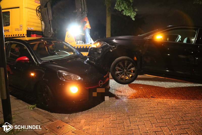 ongeval frontaal 3Schijndel - Twee personenauto's zijn woensdagavond betrokken geraakt bij een frontale aanrijding op de Jan van Amstelstraat, ter hoogte van het Lidwinahof. Een van de voertuigen kwam op de verkeerde weghelft terecht en belandde door de klap met de neus bovenop het andere voertuig.