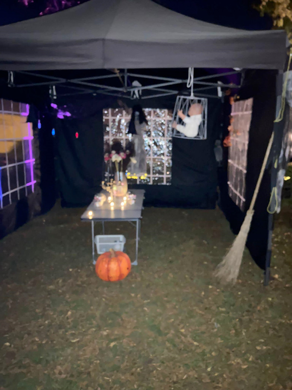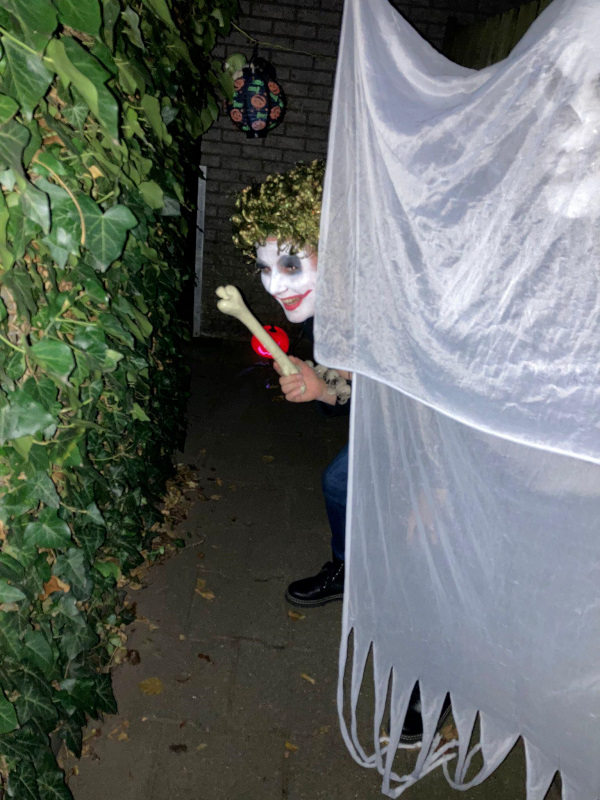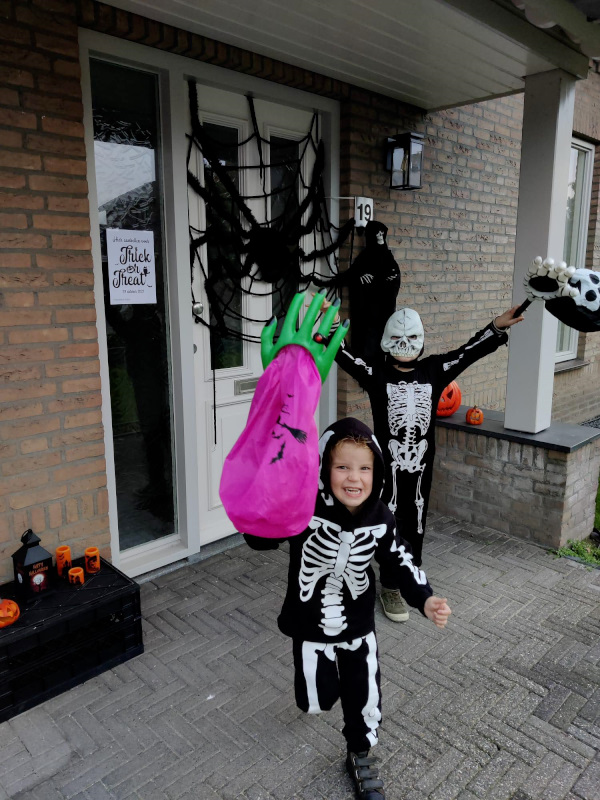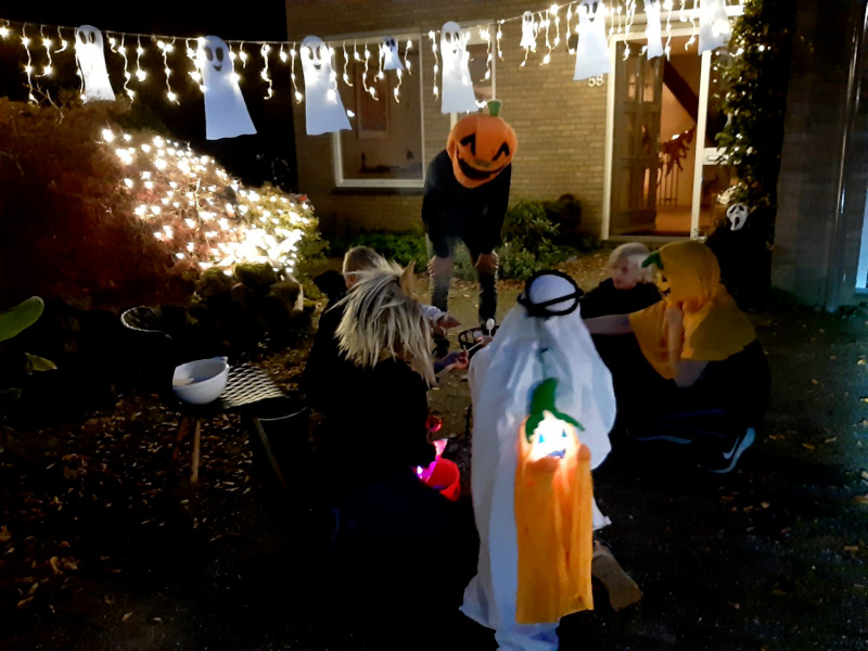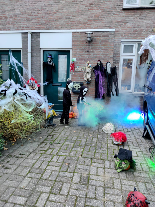 halloweenplein10Schijndel - Ook in Wijk Plein werd afgelopen weekend Halloween gevierd. De kinderen konden bij 26 adressen langs voor hun Trick or Treat. Sommige buurtbewoners hadden samengewerkt en er een groot spektakel van gemaakt. Eén van de speeltuinen in de wijk was omgebouwd tot heksenhol met een echte heksenketel en muziek. En een griezelbrandgang met echte griezels om de kinderen te laten schrikken, een rookmachine en enge muziek. Alles om de kinderen de stuipen op het lijf te jagen. Elk jaar wordt er groter uitgepakt en het wordt steeds leuker. Soms moesten de kinderen eerst een opdracht doen voordat ze een snoepje mochten pakken.