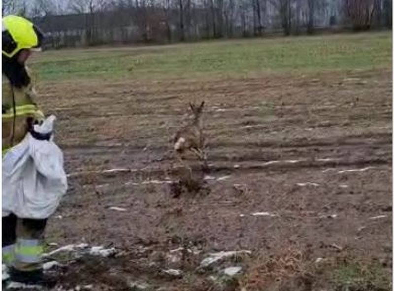 De brandweer heeft met een hydraulische spreider het hekwerk ruimer gemaakt zodat het dier los kwam. Door het hoofd af te dekken bleef het dier rustig en werd het in een nabij gelegen weiland weer vrijgelaten in de natuur. Foto: brandweer Schijndel