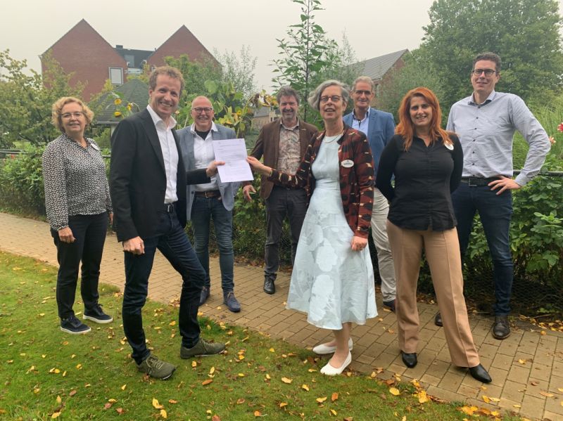 laverhofbutterflySchijndel - Laverhof en Butterfly Effect gaan na een jaar van verkenning samenwerken om een zorgzame gemeenschap voor jong en oud verder te ontwikkelen bij locatie Annahof Plus in Wijbosch. Naast de mooie dorpsgroentetuin achter St. Barbara worden de eerste zes kleine woongelegenheden geplaatst. Huurders die met hun talenten en interesses ondersteuning willen verlenen op het gebied van welzijn aan de bewoners van Annahof en St. Barbara zijn hier van harte welkom. Het project sluit aan bij de ontwikkeling van Annahof Plus, dat in het teken staat van de leefgemeenschap, waarbij mensen voor elkaar klaar staan. Berthe de Jong, raad van bestuur a.i. van Laverhof en Stijn van Kreij, directeur van Butterfly Effect tekenden hiervoor op 7 oktober jl. de samenwerkingsovereenkomst in het gezelschap van het managementteam van Laverhof en Peter Verbraak die als ambassadeur van Butterfly Effect, Laverhof en Butterfly Effect bij elkaar heeft gebracht. (foto: vlnr: Monique Janus, directeur zorg, Stijn van Kreij, directeur Butterfly Effect, Peter Verbraak, ambassadeur Butterfly Effect, Fred van der Heijden, directeur zorg, Berthe de Jong, raad van bestuur a.i. Henri van Boxmeer, projectleider bij Laverhof, Marisa Netten, manager HRM, Gijs Matthijsse, manager controle, financiën en informatie (CFI))