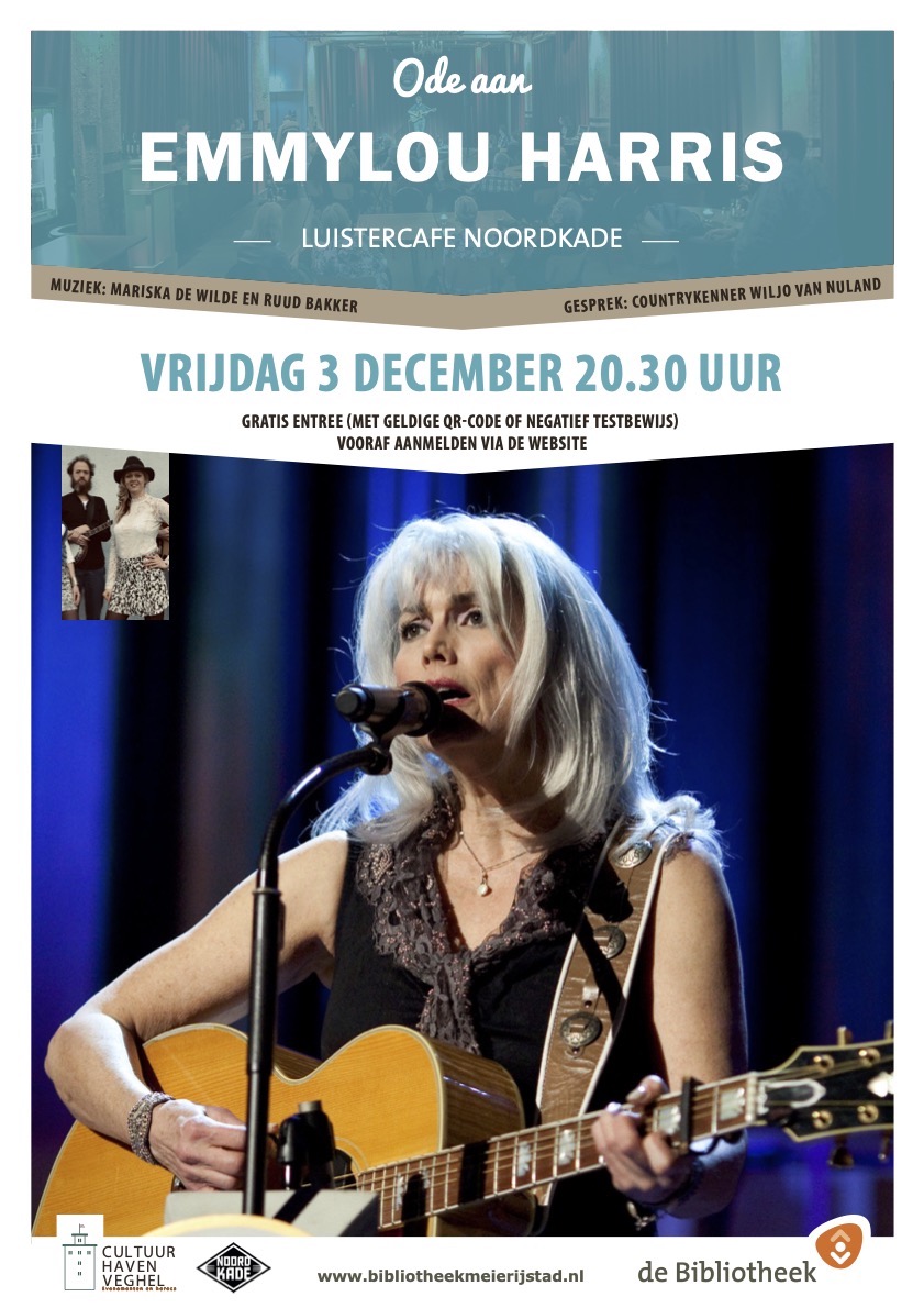 Tijdens het derde Luistercafé van dit seizoen brengen Mariska de Wilde en Ruud Bakker de muziek van Emmylou tot leven. Deze bevlogen muzikanten weten de fervente countryfan én iedereen die minder bekend is met het genre te betoveren. Wiljo van Nuland is de spreker van de avond. Als echte kenner van country, folk en bluegrass kan hij ons als geen ander meer vertellen over Emmylou Harris.