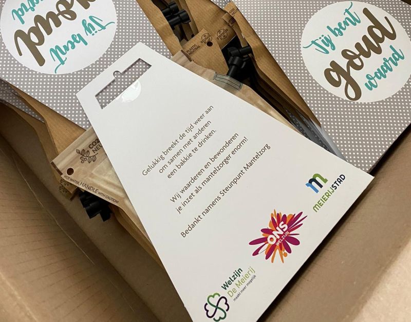 mantelzorgpresentjeMeierijstad - Mantelzorgers zijn altijd onmisbaar. En in deze tijden van corona zijn ze vaak nog meer bezig metde zorg voor hun naaste. De gemeente Meierijstad heeft daarom deze week samen met het mantelzorgsteunpunt van Welzijn De Meierij en ONS Welzijn zo’n 2.000 geregistreerde mantelzorgers een cadeautje bezorgd. Ruim 70 vrijwilligers van Welzijn De Meierij en ONS welzijn zijn maandag 8 juni op stap geweest om mantelzorgers in Veghel, Sint-Oedenrode en Schijndel te verrassen met een originele wenskaart met de tekst “Jij bent goud waard” en heerlijke fairtrade koffie. Gemeente Meierijstad wil op deze manier de mantelzorgers een hart onder de riem steken.
