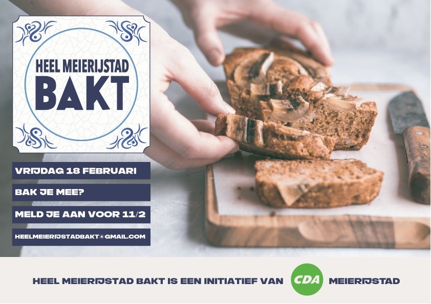 Het kan om één persoon gaan, maar ook een groepje mensen zijn. En vindt je het leuk om je recept te delen? Stuur dan je recept naar onder vermeld mailadres dan worden alle recepten op Facebook en Instagram gepubliceerd. Met Heel Meierijstad Bakt vraagt het CDA inwoners op vrijdag 18 februari iets lekkers te bakken voor iemand die het naar jouw mening verdient. Een mooie taart, lekkere cake of een ander baksel van je allerlekkerste recept.