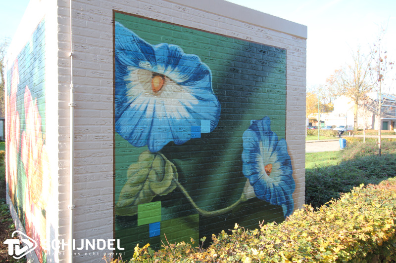 kpnmuurschilderingSchijndel -  Afgelopen vrijdag onthulde wethouder Menno Roozendaal het met bloemmotieven beschilderde KPN-verdeelstation, beter bekend als het 'KPN-huisje' aan de Zonnebloemstraat. Het thema 'bloemen', gekozen door de inwoners van de wijk, symboliseert de verbinding met de wijk.