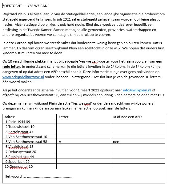 Op deze manier wil wijkraad Plein de actie ‘Yes we can!’ onder de aandacht van wijkbewoners brengen én kunnen kinderen op een leuke manier actief op zoek naar de letters.