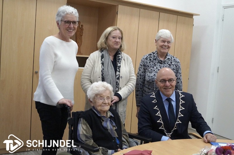 ZrvdBoomen3Schijndel - Kees van Rooij ging op vrijdagmiddag 31 januari voor de derde keer in zijn ambtsperiode op verjaardagsvisite bij zuster van der Boomen. Zij wordt 106 jaar en vierde dat al voor de burgemeester. Zuster Marcelliana van den Boomen woont in het moederhuis aan de Pastoor van Erpstraat in Schijndel en genoot zichtbaar van het bezoek van de burgervader. Twee nichtjes zagen hoe de jarige volop buurtte en genoot van een stuk taart en de aandacht die zij kreeg. De burgemeester ging in 2018 en in 2019 al eens bij zuster van der Boomen langs om haar verjaardag als oudste inwoner van Meierijstad te vieren.