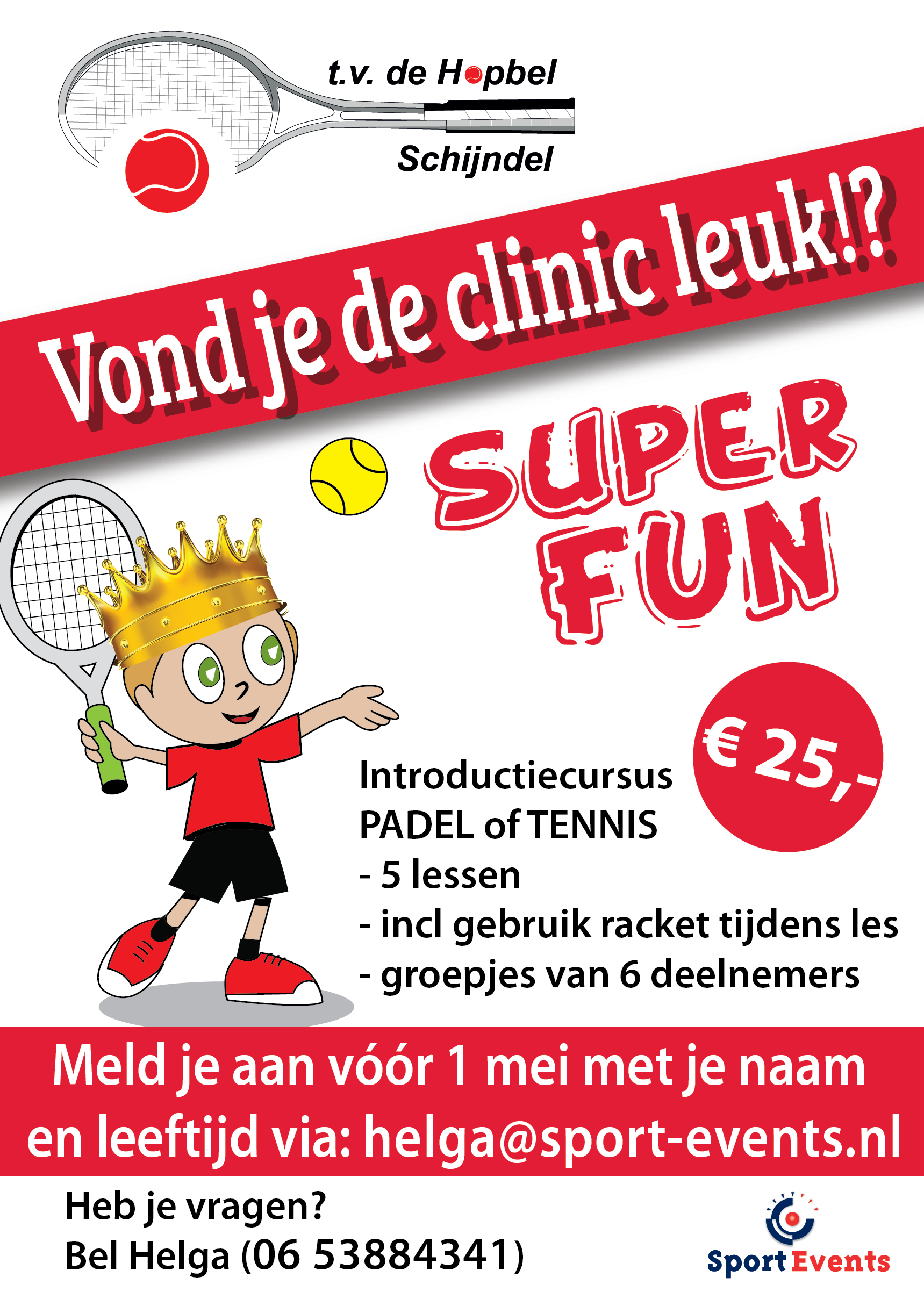tennisvereniging tvdehopbelschijndel 2019Schijndel-Tennisvereniging de Hopbel heeft een leuke actie voor kinderen om kennis te maken met padel en tennis. Er zijn 5 introductie lessen in kleine groepjes. Aanmelden voor 1 mei bij Helga sport events.  Alle informatie staat in onderstaande flyer.