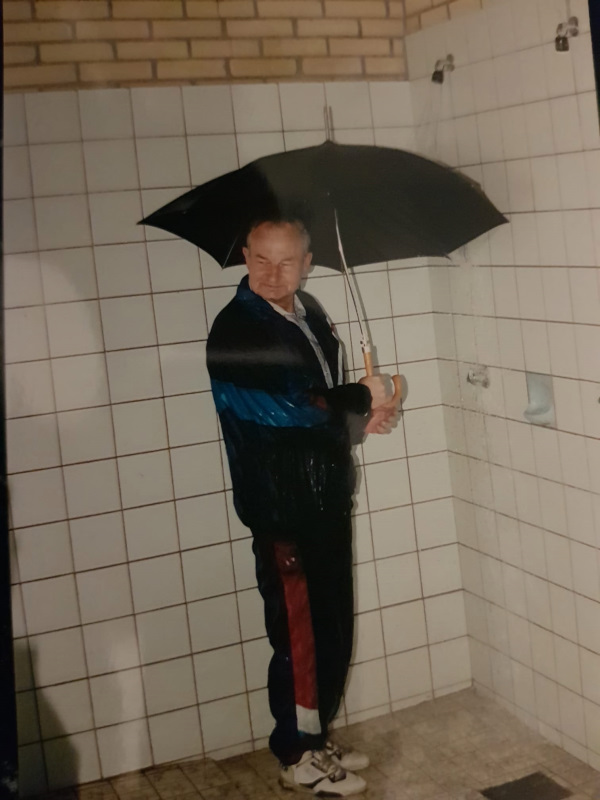 (Piet werd traditiegetrouw onder de douche gezet, omdat zijn team F1 kampioen was geworden, maar Piet had zich voorbereid...)