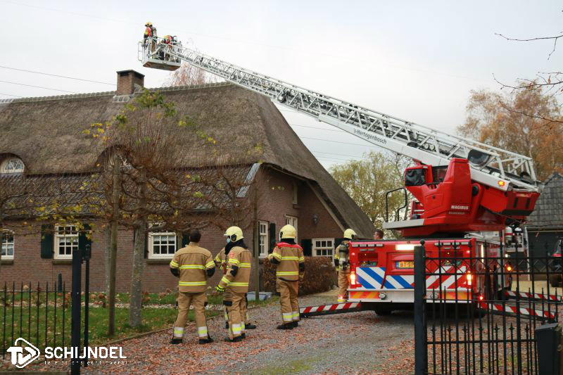 molendijknoordschoorsteen4Schijndel - De brandweer van Schijndel werd aan het eind van de dag opgeroepen voor een schoorsteenbrand. Aan de Molendijk-Noord had een bewoner vlammen uit de schoorsteen opgemerkt. Daarop werd snel de klep van de kachel dichtgezet en 112 gebeld. Ook politie en de hoogwerker uit Den Bosch kwamen ter plaatsen. Door het snelle handelen van de man bleef het bij een korte controle en het vegen van de schoorsteen. De as werd in de emmer afgeblust en in de berm achtergelaten. De politie regelde korte tijd het verkeer. Rond half vijf vertrokken de brandweerploegen weer retour kazerne. Enkele foto's onder 'lees meer'.