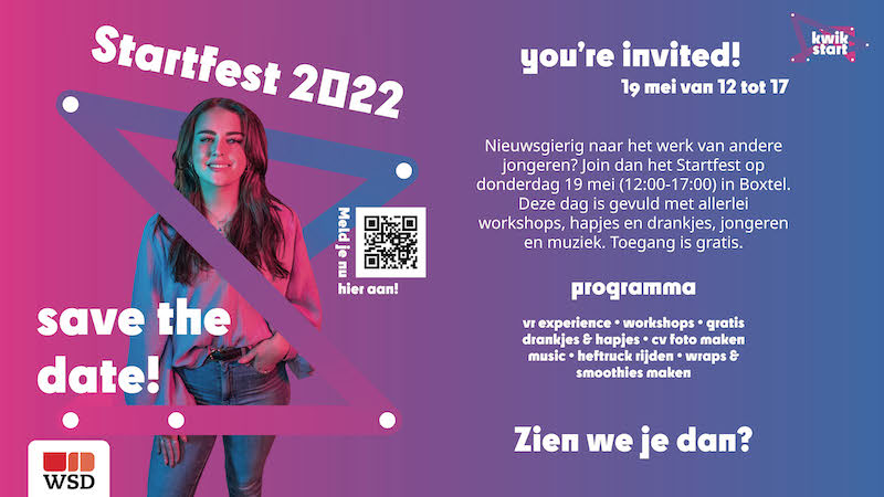 “Op 19 mei organiseren we ons Startfest. Dit festival is er voor alle inwoners tussen de 15 en 29 jaar van de gemeenten waarvoor wij werken”, vertelt Kim Hagens, trajectconsulent jongeren bij WSD Kwikstart. “Lukt het je niet om zelf een baan te vinden? Kom dan naar WSD in Boxtel, Schouwrooij 20. Van 12 tot 17 uur hebben we hier allerlei workshops, enthousiaste jongeren, hapjes en drankjes en muziek. We laten je kennismaken met WSD Kwikstart en alle mogelijkheden voor jou.”
