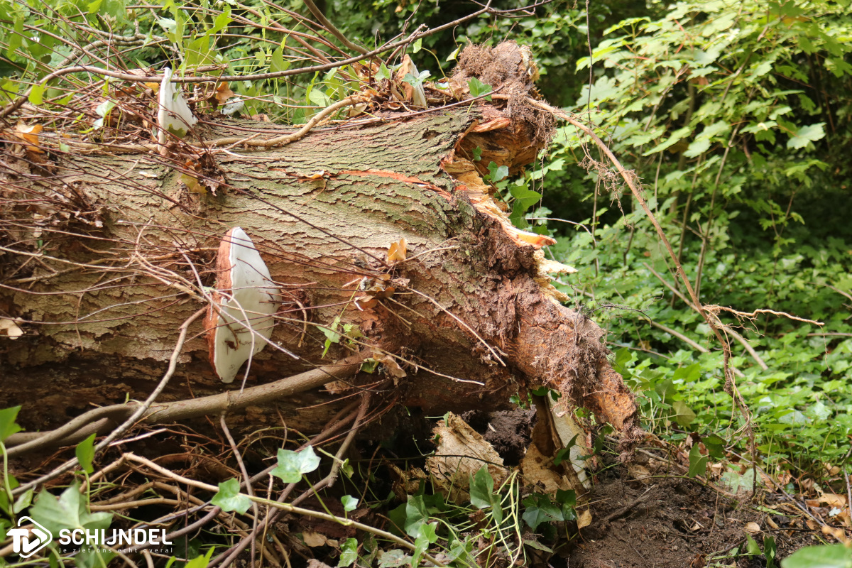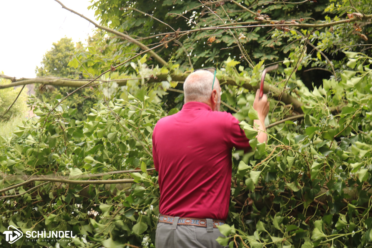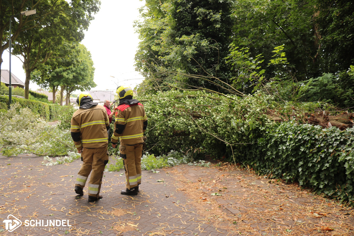 Een straatnaambord werd op een haar na gemist. Een hulpzame buurtbewoner was al begonnen met zagen om een doorgang te creëren. De brandweer sloot de weg af voor het verkeer en nam de zaagwerkzaamheden daarna over. Enkele foto's onder 'lees meer'.