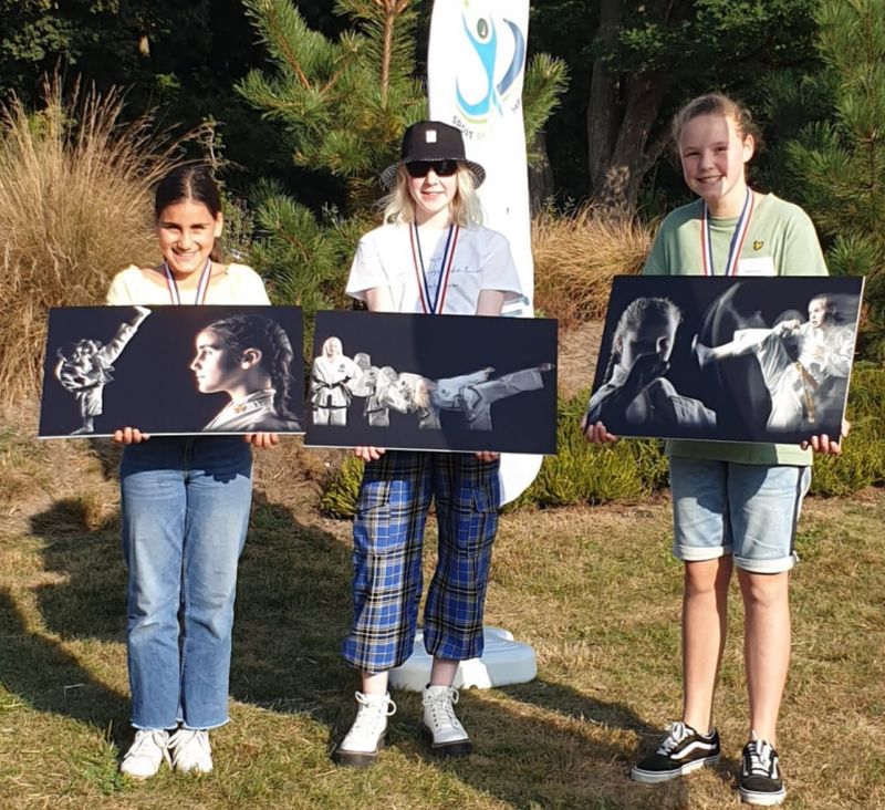teakwondo2Schijndel - Rebecca Broeren, Elena Hambartsumian en Roos Gordijn gehuldigd voor hun mooie prestaties op het Nederlands kampioenshap in Delft op 17 november 2019. Roos en Rebecca hadden hier een 3e plaats behaald bij het onderdeel Tul. Elena Hambartsumian behaalde een 2e plaats bij sparring en een 3e plaats bij het N.K springen. Nadat werd aangekondigd dat de huldiging in maart niet door zou gaan hebben ze nog even moeten wachten maar zaterdag 19 september was het dan eindelijk zover, maar wel met de nodige maatregelen, op een mooie locatie bij de Helden van Kien. Ze werden beloond met een medaille, oorkonde, een roos en een prachtige foto. Foto: Jeroen van Schaik Fotografie
