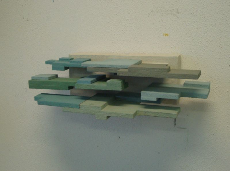 Met eenvoudige houten constructies bouwt hij zijn werk. Driedimensionale objecten met gedempte kleuren en een korrelig oppervlak alsof ze bedekt zijn met stof. Het zouden gebouwen kunnen zijn waarvan we alleen de contouren zien. Het werk gaat over commerciële landschappen en het al dan niet bewaren ervan.