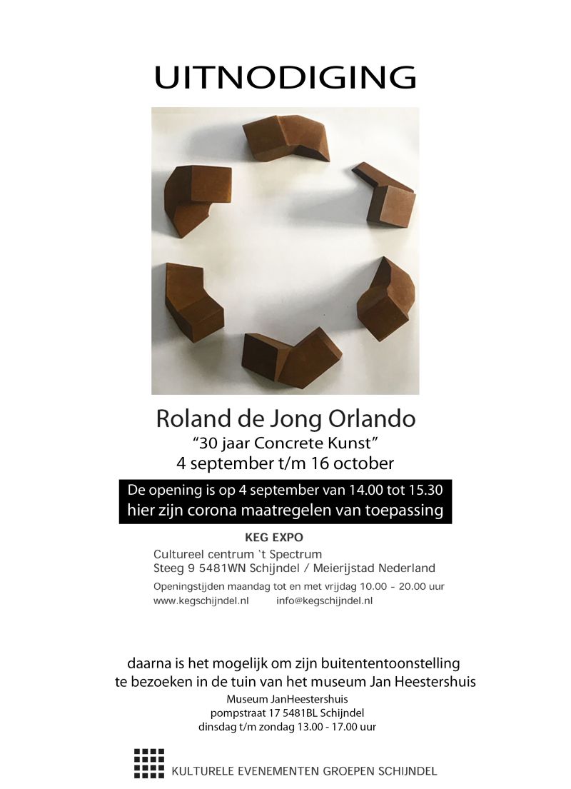 De tentoonstelling van Ronald de Jong Orlando is te zien in de KEG EXPO tijdens de openingstijden van ’t Spectrum van maandag tot en met vrijdag van 10:00 – 20:00 Steeg 9 Schijndel www.kegschijndel.nl. De buitenexpositie in de tuin van het museum Jan Heestershuis Pompstraat 17 Schijndel, is te bezoeken van dinsdag tot en met zondag van 13.00 - 17.00 www.museumjanheestershuis.nl