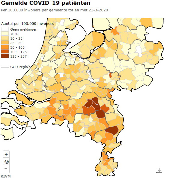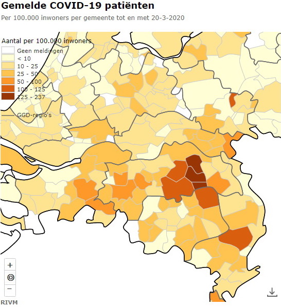 Besmettingen rivm 21032020Den Haag – Het aantal gemelde COVID-19 patiënten zijn gisteren weer explosief gegroeid, zo meldt het RIVM. Gisteren bedroeg het aantal positief geteste patiënten 3631. Vandaag, zondag 22 maart, is dat 4204. In deze regio in Noordoost-Brabant was eerder Meierijstad het hardst getroffen. Het aantal gemelde patiënten in de omliggende gemeenten Boekel, Gemert-Bakel, Sint-Anthonis, Uden, Landerd en Bernheze zijn inmiddels hard gestegen. Daarbij vallen Meierijstad en Sint-Anthonis in de een na zwaarste categorie terwijl de overige gemeenten in de zwaarste categorie terecht zijn gekomen met als grootste uitschieter Boekel met 302,2 (per 100.000 inwoners, aantal per 21 maart 2020 14.00 uur). Onderstaande kaarten geven een overzicht van de stand van zaken op 20 maart en gisteren 21 maart 14.00 uur (meest actuele ook  hiernaast). Alle cijfers zoals doorgegeven door GGD Gemeentelijke Gezondheidsdienst'en en gemeenten (door correcties achteraf in het systeem kunnen wijzigingen optreden). Hieronder de oproep van onze burgemeester Van Rooij.