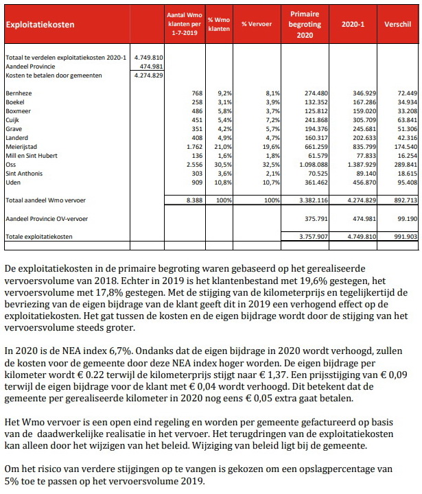 De uitgangspunten in de nota spelen in op ontwikkelingen die van invloed zijn op het vervoer van de GR-KCV Brabant Noordoost. Sinds het vaststellen van de begroting 2020 begin 2019 doen zich ontwikkelingen voor die van invloed zijn op de exploitatie en bedrijfsvoering van de GR-KCV Brabant Noordoost. Belangrijkste ontwikkeling is de aanzienlijke stijging in de vervoerskosten, onder andere door een sterke toename van het vervoersvolume, een stijging van de NEA-index en bevriezing van de eigen bijdrage van de klant de afgelopen drie jaar. De voorgestelde begrotingswijziging 2020 speelt hierop in. Dit houdt een stijging van de bijdrage van gemeenten in de beheer- en exploitatiekosten in.