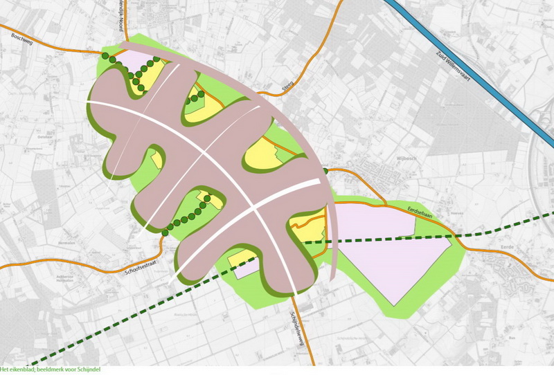 Het eikenblad als beeldmerk is leidend bij alle toekomstige ontwikkelingen: rafelrand en groene wiggen behouden. Ook bij nieuwe ontwikkelingen de randlengte met het landschap zo groot mogelijk houden. Dat betekent lobben handhaven, groen houden.