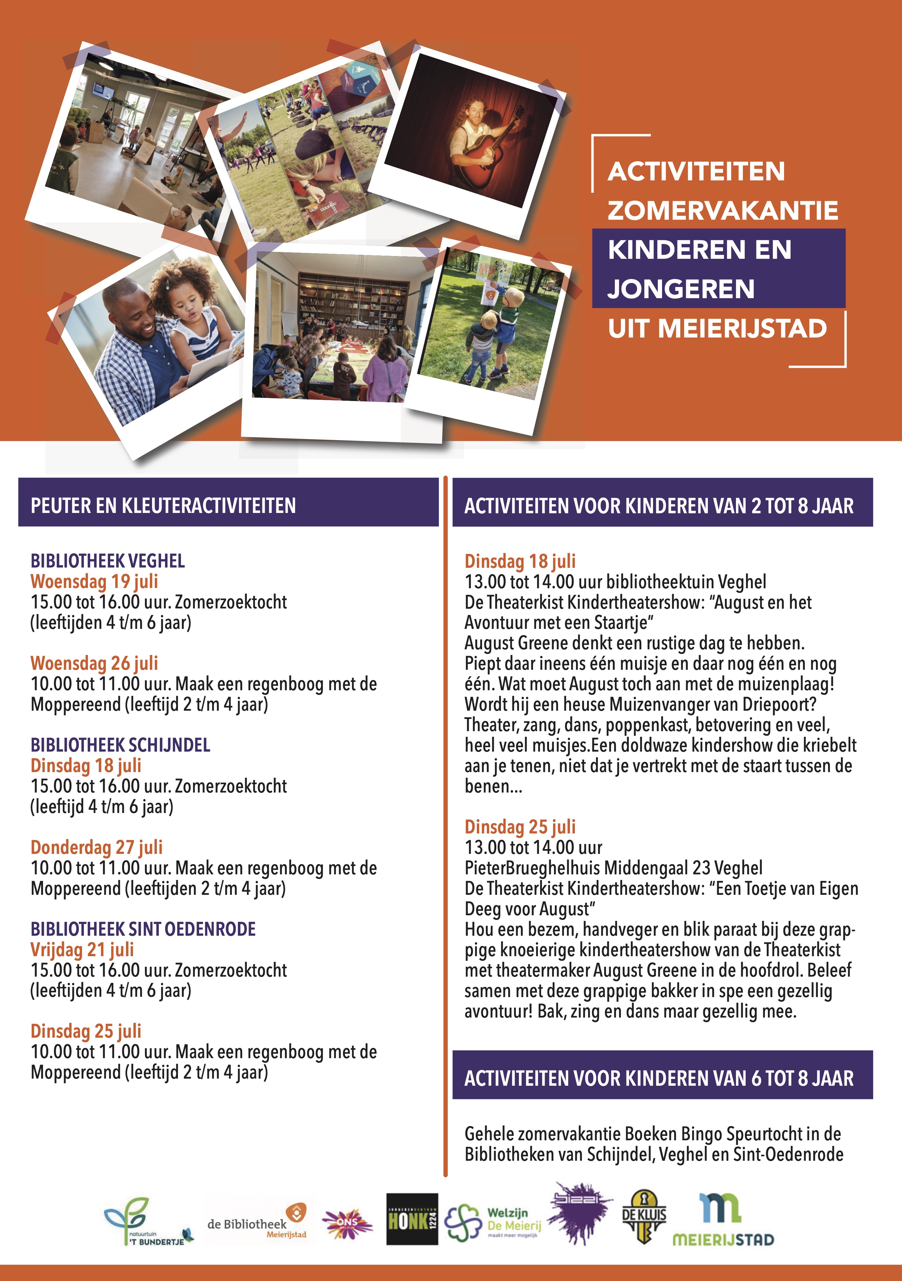 Flyerzomervakantiejongeren1 2023Meierijstad - Meierijstad organiseert activiteiten voor kinderen en jongeren in de zomervakantie. In de eerste en tweede week van de zomervakantie staat een leuk activiteitenprogramma gepland in Meierijstad om samen sportief bezig te zijn, educatief bezig te zijn, elkaar te ontmoeten en vooral plezier te beleven met z’n allen!
