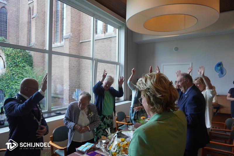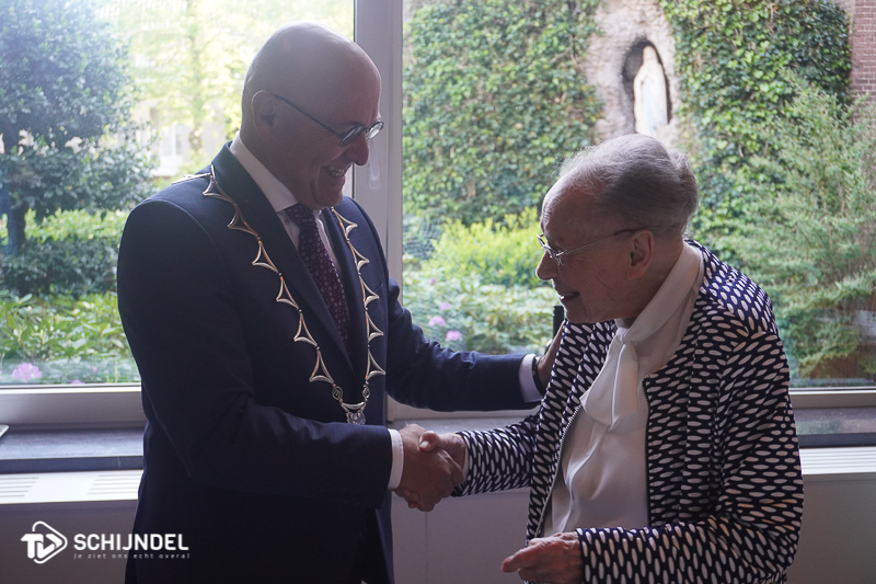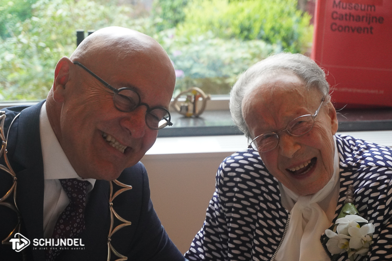zuster1005Schijndel - Op zondag 15 mei was het groot feest in het Moederhuis bij de Zusters van Liefde. Zuster Marie Gabriel van den Heuvel werd 100 jaar. Burgemeester Van Rooij kwam Zuster Marie Gabriel persoonlijk feliciteren en overhandigde een mooie bos bloemen. De zusters van Liefde te Schijndel vierden de verjaardag middels een (besloten) eucharistieviering en een feestelijk diner, samen met de aanwezige familieleden en burgemeester Van Rooij. Ook haar enige nog in leven zijnde broer van 87 was aanwezig. Zuster Marie Gabriel genoot zichtbaar van alle festiviteiten. Foto's van dit bijzondere moment vindt u in het fotoboek.